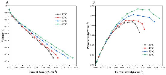 Fuel cell performance curves at different humidification temperatures. (A) Polarization curves and (B) power density curves.
