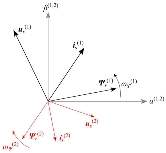 Figure 1. Vectors of voltage, stator current and rotor flux in the double coordinate system α(1,2)-β(1,2).