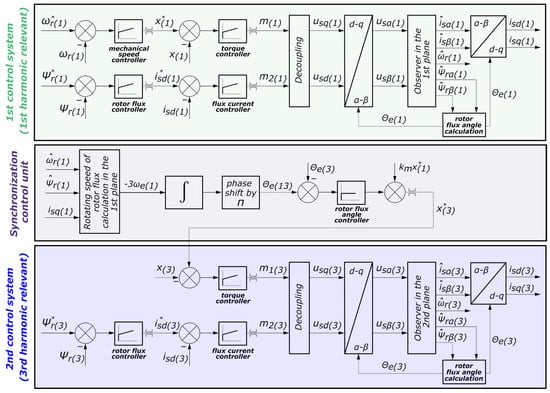 Several control methods were implemented in connection with five-phase induction motors, i.e., Field-Oriented Control [15], Direct Torque Control [20], and multiscalar model-based control [21,22]. For controlled third harmonic injection, two independent control systems for every orthogonal plane have to be implemented. To achieve the desired quasi-trapezoidal flux distribution, the synchronization of two rotor flux vectors (1st and 3rd harmonics, respectively) was used in the control system. Figure 1 shows the used control structure, in which three main blocks can be distinguished: (1) 1st harmonic system, (2) 3rd harmonic system, and (3) synchronization unit. Control as well as estimation are synthesized on the basis of the machine model in two planes—Figure 1. Variables in two planes are obtained after performing a modified Clarke transformation for a five-phase system. These variables are independent of each other. Figure 1 presents vectors of voltage, current and rotor flux in two planes α(1,2)-β(1,2). The first block realizes the control of variables oriented in the first coordinate system d(1)-q(1). The control system associated with the fundamental harmonic includes a cascade of speed and torque controllers, as well as rotor flux and magnetization current. The second control system contains a controller of torque, flux, and magnetization current in the plane d(3)-q(3). The last main block provides synchronization of the two rotor flux vector positions. Based on the angle controller output, the reference torque in the second coordinate system is calculated. Finally, based on the outputs of the PI controllers and decoupling blocks, the reference voltage components for two coordinate systems d(1,3)-q(1,3) are determined. These quantities are delivered to the observer blocks and the Space Vector Pulse Width Modulation (PWM) block. The modulation algorithm allows for the independent generation of first and third harmonic waveforms [18].