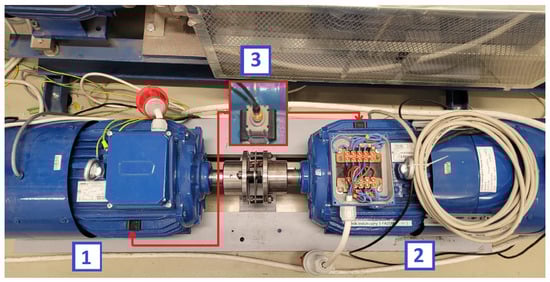 Figure 3. The tested drive unit with a 5-phase motor (1) as a driving motor and a second motor (2) as a loading motor. The number (3) indicates the locations of the accelerometers.