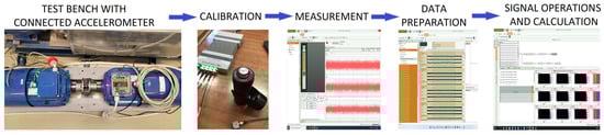 A system from Brüel & Kjær (B&K) was used for vibration measurements. The measurement system included a four-channel data acquisition module (B&K type: 3676-B-040), a 3-axis accelerometer (B&K type: 4529-B, its parameters are: frequency band: 0.3–12,800 Hz, weight: 14.5 g, sensitivity: 10 mV/ms−2), a calibrator (B&K type: 4294), and a laptop computer that was equipped with B&K’s firm vibration measurement and analysis software called BK Connect. A vibrodiagnostic measurement system was used in the work of Refs. [8,23], which used a similar measurement methodology. The accelerometer was mounted to the motor housing using connectors that are included with the system by its supplier. A flow diagram of the measurement procedure is shown in Figure 4.