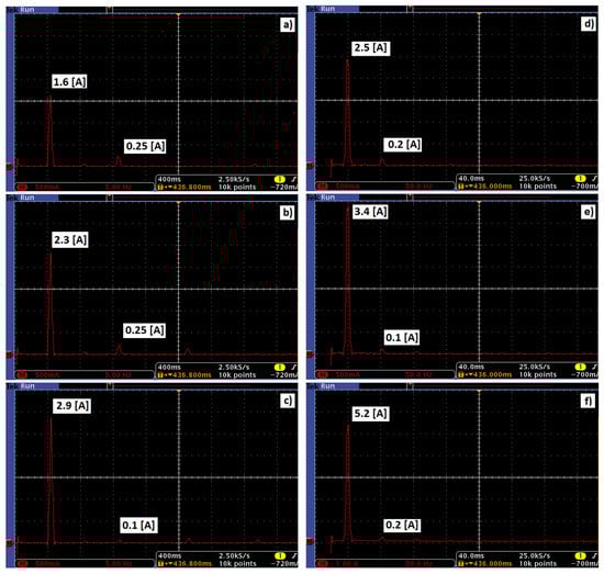 Figure 5. Current spectra recorded with an oscilloscope for phase B at no-load motor operation in the following cases: (a) motor operating with all phases at 150 rpm, (b) motor operating without phase A and at 150 rpm, (c) motor operating without phases A and C at 150 rpm, (d) motor operating with all phases at 750 rpm, (e) motor operating without phase A at 750 rpm, (f) motor operating without phase A and C at 750 rpm.