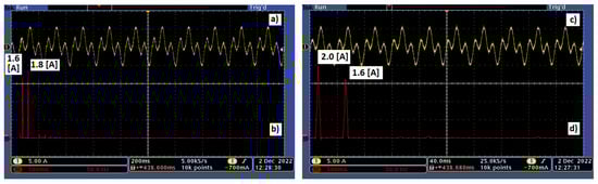 In turn, Figure 6 shows oscillograms, which present current waveforms with the third harmonic added as a result of control. These are the results recorded for a motor running with no load at 150 rpm. In addition to the current waveform, its spectrum is also shown. In the spectrum shown, the influence of the third harmonic, whose value exceeds that of the fundamental harmonic, can be clearly seen.