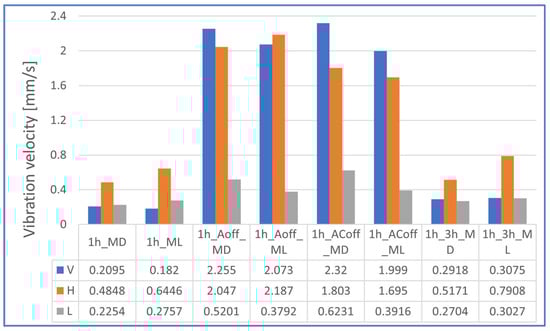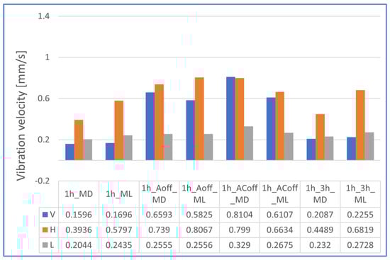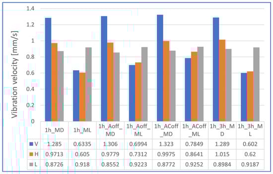In the first stage of the analysis, RMS values for vibration velocities in the band up to 1 kHz were determined in accordance with the recommendations of the standard [25,26] and are presented as characteristics in Figure 7, Figure 8, Figure 9 and Figure 10.