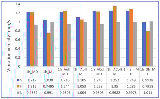 For the motor operating without load (Figure 9) and at increased speed (750 rpm), a general increase in vibration can be observed, which remains at a similar level for all cases considered. These vibrations fall within zone B, that is, they do not exceed 1.8 mm/s. Significantly smaller vibrations were registered on the load motor than on the drive motor. In this case, it can also be seen that vibrations in the axis of the motor shaft (L direction) are at a similar level, while vibrations in the V and H directions change.