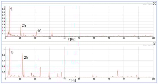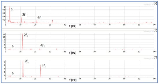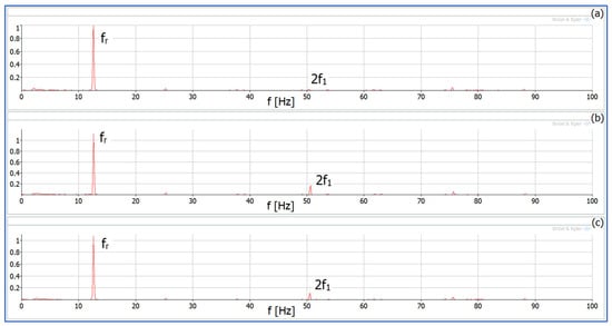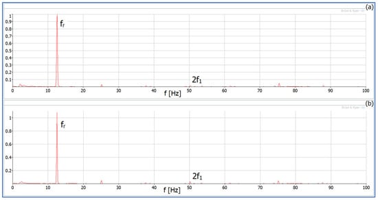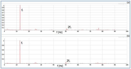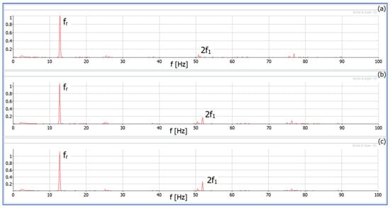 For the characteristics recorded for a much higher speed (Figure 13 and Figure 14), i.e., 750 rpm, it was noted that switching off one or two phases results in only a slight increase in vibration for the frequency resulting from the motor’s operating speed, and a slight increase in vibration values for a frequency (2f1) that is twice the frequency f1. For a motor operating under load, an increase in frequency 2f1 of about 4% can be observed. Similarly, as for the lower motor speed (150 rpm), there was a change in the frequency of vibration fr of about 1%.