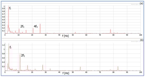 Figure 16. Vibration spectral characteristics for a rotational speed of 150 rpm and under load, where (a) characteristic—1 h supply, (b) characteristic—1 h and 3 h supply.
