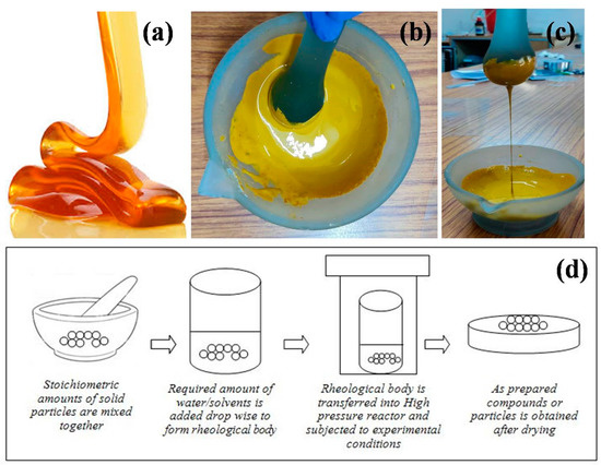 The process of preparing compounds from the solid-liquid rheological mixture through chemical reactions is called the Rheological Phase Reaction (RPR) method. Initially, the stoichiometric molar ratios of the solid reactants (raw materials) are mixed thoroughly using mortar and pestle. Later, the solid–liquid rheological mixture is obtained by adding an appropriate amount of water or other organic solvents (one or two drops) to the well mixed solid reactants, in which the solid particles and liquid substance are uniformly distributed. The resultant mixture will be smooth and viscoelastic as the honey (Figure 1a–c). Finally, the obtained rheological body is transferred to the high pressure reactor and kept at a constant temperature and pressure for an appropriate time. The rheological body collected from the high pressure reactor is then dried in a petri dish for the desired time until the dry powders are obtained. The smooth powders are then calcinated at the desired temperature and time to obtain the required compounds. The schematic illustration of rheological phase reaction method is shown in Figure 1d.