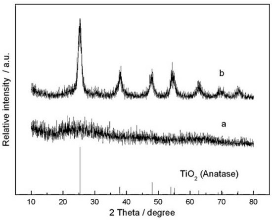 XRD pattern of the precursors with heat treatment (autoclaved) (represented as ‘a’ in the graph) and without heat treatment (represented as ‘b’ in the graph). Reprint with permission [54]; Copyright © 2009 Elsevier Ltd. All rights reserved.