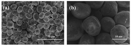 SEM images of spherical Ni0.5Mn0.5CO3 carbonate by the Coprecipitation route at (a) 50 µm and (b) 10 µm. Reprint with permission [55]; © 2014 Elsevier Ltd. All rights reserved.