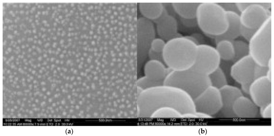 Fe3BO6 prepared at 800 °C for 5 h was formed as well spherical particles (Figure 5a) of uniform size of about 40 nm. Just the increase in calcination temperature to 900 °C resulted in uniform nano spherical particles of increased diameter of 100 to 500 nm (Figure 5b). The grains agglomerated randomly by an increase in calcination temperature. The particles prepared at 800 °C for 5 h were found to act as the best anode material with a high reversible capacity of about 500 mAh/g with a significant depth of discharge.