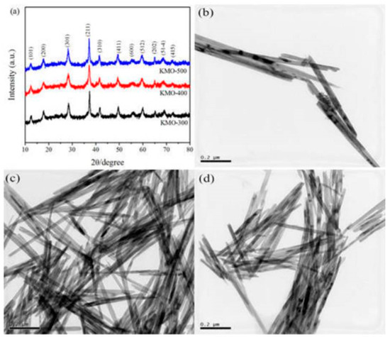 (a) XRD patterns of KMn8O16 and SEM images of KMn8O16 prepared at (b) 300 °C, (c) 400 °C and (d) 500 °C Reprint with permission [61] © IOP Publishing Ltd.