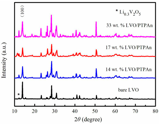 XRD patterns of the bare LiV3O8 sample and LiV3O8/Polytriphenylamine (PTPAn) composites Reprint with permission [68] © 2017 by the authors. Licensee MDPI, Basel, Switzerland.