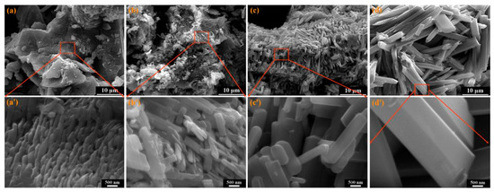 SEM images of LiV3O8 powders: (a) 450 °C and (a’) magnified image of 450 °C; (b) 500 °C and (b’) magnified image of 500 °C; (c) 550 °C and (c’) magnified image of 550 °C; (d) 600 °C and (d’) magnified image of 600 °C Reprint with permission [37] © 2011 Elsevier B.V. All rights reserved.