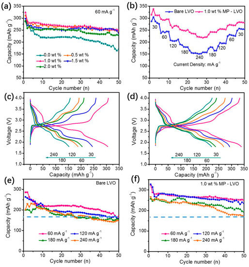 Cycling performance of MP-coated LVO samples with different MP contents at the current rate of 60 mA g1 with the voltage range of 1.8–4.0 V (a), and stepped rate capabilities of the bare LVO and 1.0 wt.% MP-coated LVO samples (b). The corresponding charge/discharge profiles of the bare LVO (c) and 1.0 wt% MP-coated LVO (d) samples originating from Figure 5b. The long-term rate properties of the bare LVO (e) and 1.0 wt% MP-coated LVO (f) samples. Reprint with permission [10] © 2018 Wiley-VCH Verlag GmbH & Co. KGaA, Weinheim.