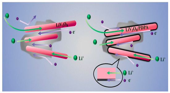 | LiV3O8/PDPA composite | Stoichiometric amounts of LiOH.H2O, NH4VO3, and C6H8O7.6H2O | In situ polymerization of the LiV3O8 made by the RPR method | Nanorods with slippery surface | Sloppy surface, uniform particles and jagged edges | [70] |