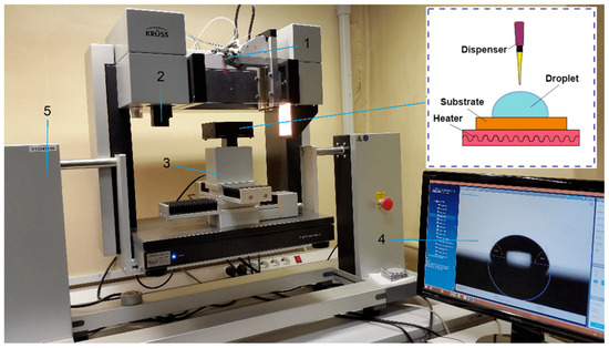 KRÜSS DSA 100 experimental setup: 1—dosing system; 2—camera; 3—three-axis positioning system; 4—processed image of a droplet; 5—automatic inclination system.