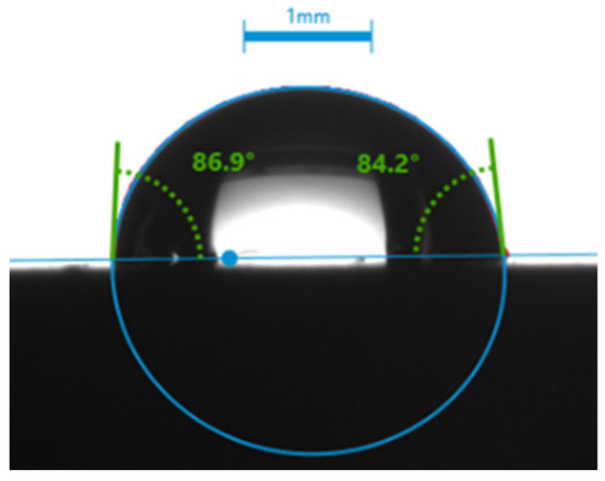 The initial liquid drop volume was about 2–3 μL. The KRÜSSDSA Advance software allowed the processing of the shadow images of evaporating liquid droplets in fully automatic mode 2 (real-time determination of the droplet volume, base diameter and contact angles). Figure 2 shows a photograph of the liquid droplet shape analysis.