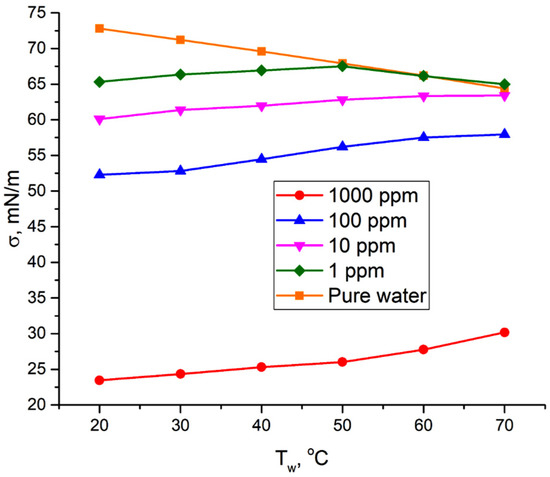 Aqueous solutions with four different concentrations of SLS were investigated and pure water was examined for comparison. Figure 3 shows temperature dependence of surface tension of aqueous solutions with surfactants.
