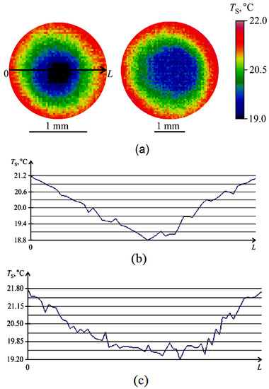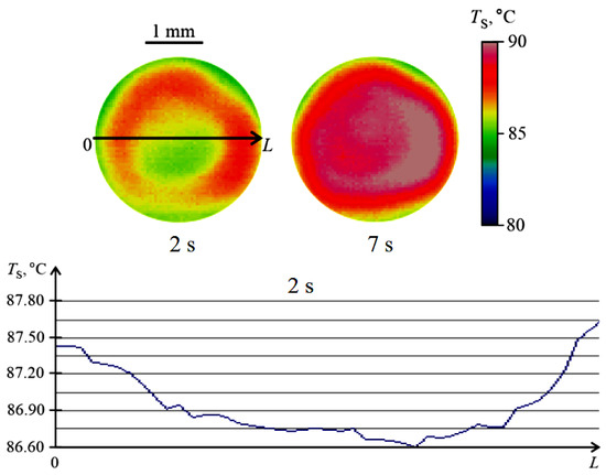 Figure 4 shows the evolution of a pure water drop during evaporation under isothermal conditions at a room temperature of about 21 °C. Since the drop has a small volume of the order of 1 μL, its shape is a spherical cap. In this case, evaporation apparently occurs at a fixed contact line, with the so-called “pinning” of the contact line. The evaporation is as a result of the diffusion of vapor from the drop surface, where it is saturated, into the atmosphere with a constant vapor concentration (in the experimental conditions, the humidity was about 30–40%). The evaporation is almost uniform over the entire surface area and is well described by Stefan’s theoretical model [13]. Droplet evaporation on the heated surface qualitatively coincides with isothermal evaporation, but there are important differences. In this case, the mass flow from the droplet surface is substantially nonuniform. A significant mass flow is provided by intense evaporation in the area of the contact line, called the microregion [36].