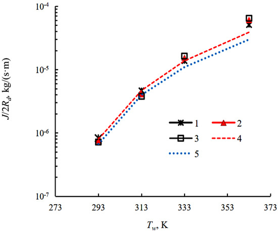 where αl is the liquid heat transfer coefficient, Ucl ∼ c(Ma + Ra), Ul is the average convective velocity in the liquid droplet, the Marangoni number Ma = (ΔTwh/μlal)(dσ/dTs), the Rayleigh number Ra = gβTΔTwh3/νlal, βT is the thermal liquid expansion, g is the gravity acceleration, ΔTw = Tw − Ts, νl is the water kinematic viscosity, al is the liquid thermal diffusivity, and μL is the water dynamic viscosity. Empirical expressions for evaporation intensification with an increase in the Ra number are given in [41]. For very small droplets (droplet height below 1 mm), low values of Ra and Ma and low values of Ul are realized, and the condition αl ∼ 1/h (conductive heat transfer) is satisfied. Therefore, the ratio of heat fluxes for a pure water drop (ql1) to a water drop with surfactant (ql2) will be inversely proportional to the ratio of heights ql1/ql2 ∼ h2/h1. To determine the relationship between ΔTw and the heat flux, it is necessary to solve a system of differential equations and it is difficult to make a simplified estimate for the change in Δρs due to nonisothermality. Therefore, the effect of nonisothermality can only be determined after the evaluation of other parameters (key factors 1, 2, 5, 6) and taking into account experimental data. At different wall temperatures, the droplet free surface temperature and ρs were determined using thermal imaging measurements and the equilibrium curve for the equilibrium partial pressure of water vapor.