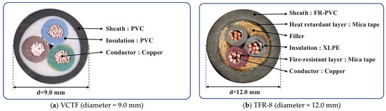 Figure 9b shows the damaged area of the TFR-8 cables. The TFR-8 cables with flame-retardant performance did not show a V-pattern fire spread tendency, unlike that of the VCTF cables. This implies that the combustion and fire spread of the cable were inhibited by the flame-retardant performance and that the fire risk was relatively low. Type 1 showed the largest damaged area under the same