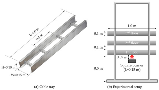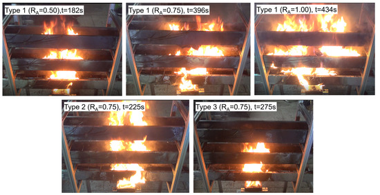 Figure 5. Considering that the sufficient thermal energy caused by an increase in the quantity of cables is used as energy for further fire spread, the increase in the maximum HRR and total heat release caused by an increase in the quantity of cables can be understood clearly. Furthermore, the area on the first floor tray through which the flame from the square burner can penetrate decreases with an increase in the