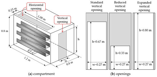 Figure 14 indicates that the thermal feedback applied from the smoke layer and walls accelerates the combustion of combustibles. Thus, examining the effects of the thermal feedback applied from the smoke layer and walls on changes in fire phenomena separately can provide useful information for reducing the fire risk. Therefore, fire tests were conducted for the various opening conditions (vertical and horizontal) presented in