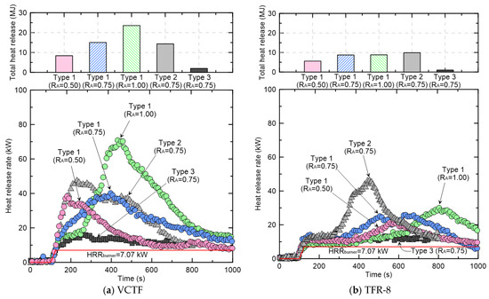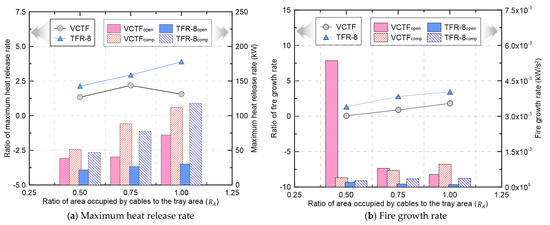 Figure 13a shows the ratio of the maximum HRR based on the combustion environment. The ratio of TFR-8 ranged from 2 to 4, and showed a greater change than VCTF, which ranged from 1.3 to 2.2. Considering that the maximum HRR in the compartment environment presented by the bar chart was similar regardless to the cable type, this difference can be attributed to the relatively low maximum HRR of the TFR-8 cables in the open environment. Furthermore, this difference indicates that the fire risk of the flame-retardant cable is significantly increased in the compartment environment. The TFR-8 cables showed a linear increase tendency when the maximum HRR ratio according to