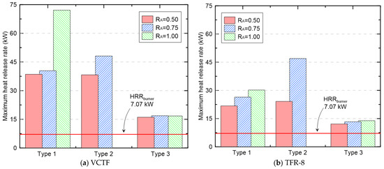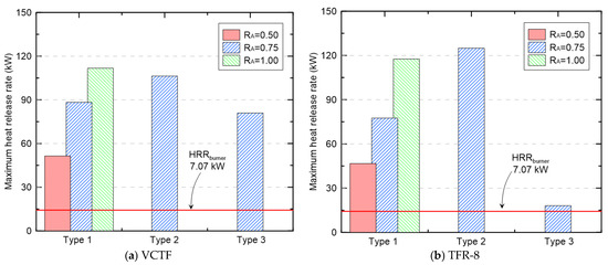 = 0.75, the maximum HRR of type 2 (approximately 48 kW) was approximately 20% higher than that of type 1 (40.4 kW). For type 3, no significant change in the maximum HRR (approximately 16 kW) was observed despite the increase in
