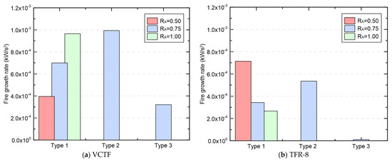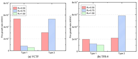 Figure 13b shows the analysis results for the ratio of the fire growth rate based on the combustion environment. In terms of ratio, the TFR-8 cables with relatively slow fire growth in the open environment exhibited a larger increase, as indicated in
