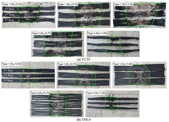 Figure 9a shows that the VCTF cables yielded a V-pattern fire spread tendency in which the damaged area increased on higher floors for type 1. Furthermore, the damaged area increased with an increase in the quantity of cables for the same arrangement method. Type 2 also showed a V-pattern fire spread behavior. Type 3 showed the opposite tendency, in which the damaged area decreased on higher floors. In terms of damage, types 1 and 2 exposed the conductors because of the combustion of the sheath and insulation; however, type 3 did not expose the conductors and only the sheath was damaged. Thus, type 3 indicates high safety.