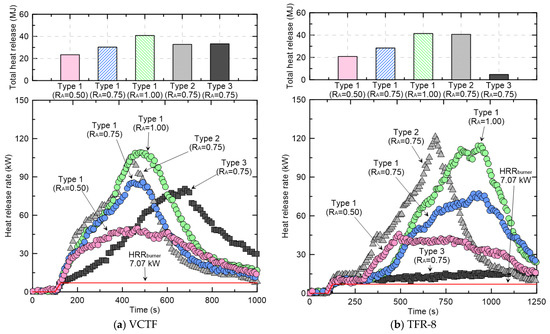 for type 1. However, unlike the VCTF cable, even if the amount of cable is increased, the change in maximum HRR and the total heat release is not quantitatively large due to the flame-retardant performance. Type 2 exhibited the highest maximum HRR under the same condition (