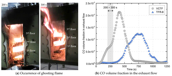 = 1.00) showed that the ghosting flame caused by the fuel concentration increased near the ceiling at 200 s. The ghosting flame was observed only near the opening where contact with oxygen is easy. Afterward, intermittent flame ejection through the opening was observed at 300 s when the environment in the compartment became more severe. This indicates that a large amount of fuel components are included in the smoke layer in the corresponding experiment. However, this fuel component is not combusted, even outside the compartment, but is collected and discharged through the duct, and it was judged that the maximum HRR was reduced due to this. As evidence, the CO volume fractions included in the flows through the exhaust duct were compared as shown in