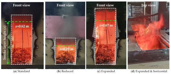Figure 15 shows the photographs of the smoke layer captured at the peak period in each experiment. Under the standard opening condition, the height of the smoke layer was 0.62 m from the floor. Under the reduced opening condition, the thickness of the smoke layer increased, and the interface was formed at a height of 0.27 m. Under the expanded opening condition, the height of the smoke layer was not significantly different compared to that of the standard opening despite the increase in the height of the opening. Under the expanded and horizontal openings condition, no smoke layers were generated because the combustion products were discharged immediately through the horizontal opening above the trays. The photographs of the horizontal opening viewed from the outside is presented in