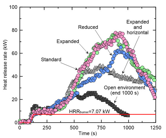 Figure 17b. The standard and expanded conditions showed similar fire growth rates, while the expanded and horizontal conditions exhibited a relatively low fire growth rate. These results suggest that the thermal feedback of the smoke layer and walls has a similar dominance over the growth of cable fires under sufficient ventilation conditions. However, when ventilation is limited as in the reduced opening condition, the fire phenomena exhibited different changes. Thus, it is necessary to conduct further research on various ventilation conditions for a clear understanding of the fire phenomena of cables burnt in a compartment. However, the results of this study on the burning characteristics of a flame-retardant cable in open and compartment environments can be expected to be useful in assessing the risk of cable fires.