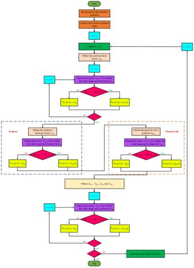 The main inspiration for this algorithm is from the observation of the living habits and behaviors of green peafowls in Yunnan Province in China. Male peafowls are referred to as peacocks, and female peafowls as peahens. Peafowl activities primarily fall into four categories: breeding behavior, food-seeking activity, social behavior, and spatial behavior [31]. The top five solutions to real-world optimization problems are referred to as adult peacocks. The individual roles of these artificial peafowl swarms may vary over time. Therefore, it is necessary to redistribute them based on fitness values after every iteration in order to maintain POA enforcement. Peacocks will rotate around food sources once they have discovered them in order to exhibit and brag to attract peahens’ attention and boost the likelihood of mating. As a result, peahens are likely to use a variety of seeking and approaching strategies throughout the entire search process in order to dynamically control their behavior throughout. In Figure 1, which illustrates the whole execution flowchart of the POA-based OPF, the maximum iteration number is denoted by the symbol .
