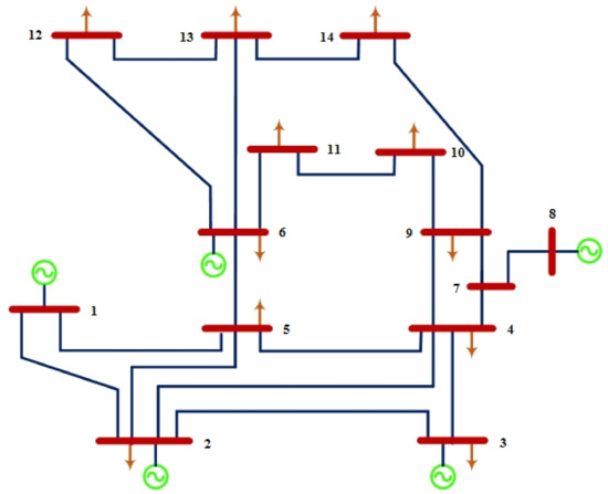 Here, by (2), a slack bus’s power is indicated by , a load bus’s voltage is indicated by , a generator’s reactive output power is indicated by , and a transmission line’s apparent power flow is indicated by . A load bus is identified by NPQ, a generation bus by NG, and a transmission line by NTL.