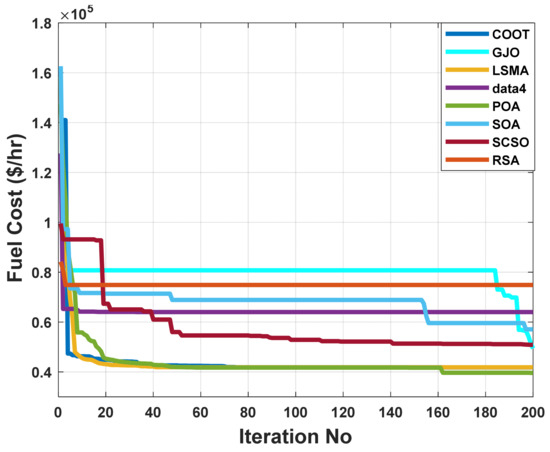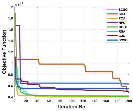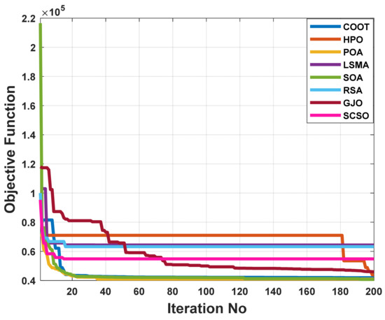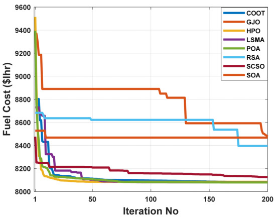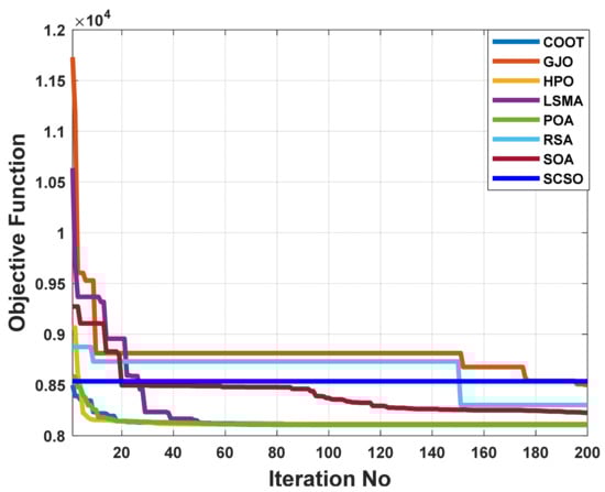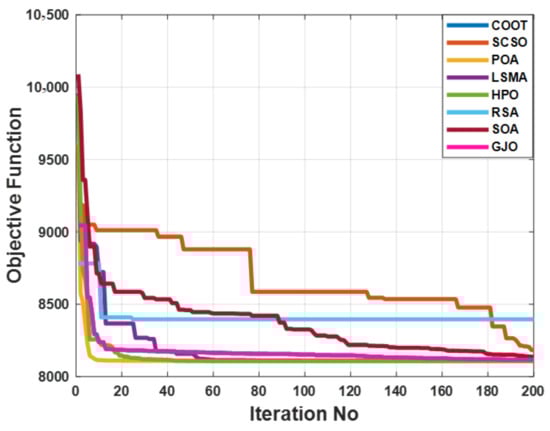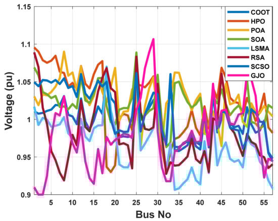 For maximizing the benefits of the suggested test system, a weighted multi-objective function is provided here. This function combines reductions in fuel operational costs, transmission power losses, and voltage-level deviations. As shown in Table 10, the multi-objective OPF issue has been addressed utilizing the POA and other comparative algorithms within the IEEE 57-bus system. It is evident from these results that POA is more efficient than other comparable algorithms when it comes to solving multi-objective OF problems. There is a superior total cost function of 41,764.3 USD/h compared to all other algorithms, which achieve 41,976.43 USD/h, 43,824.11 USD/h, 42,223.671 USD/h, 64,314.49 USD/h, 63,232.87 USD/h, 45,964.76 USD/h, and 42,897.4 USD/h, respectively, by using COOT, GJO, HPO, LSMA, RSA, SCSO, and SOA. A comparison of the POA with other algorithms demonstrates that the POA exhibits rapid and smooth convergence properties despite being compared with other algorithms as shown in Figure 26. Moreover, Figure 27 illustrates that the voltage profiles of all buses fall within the predetermined limits for POA for all comparison methods.