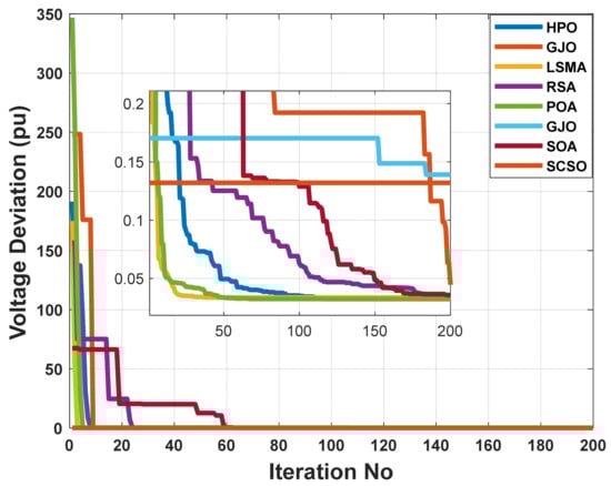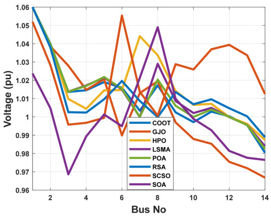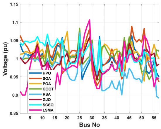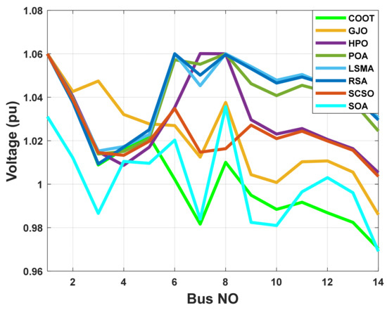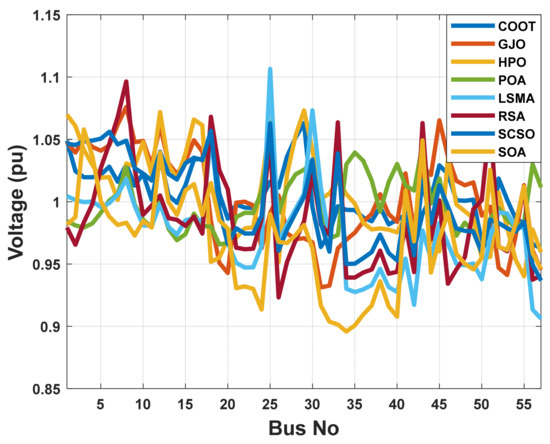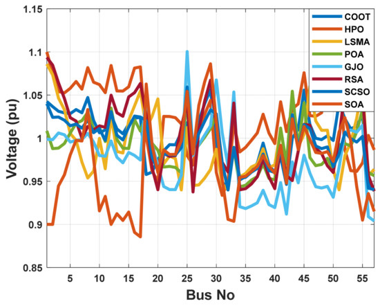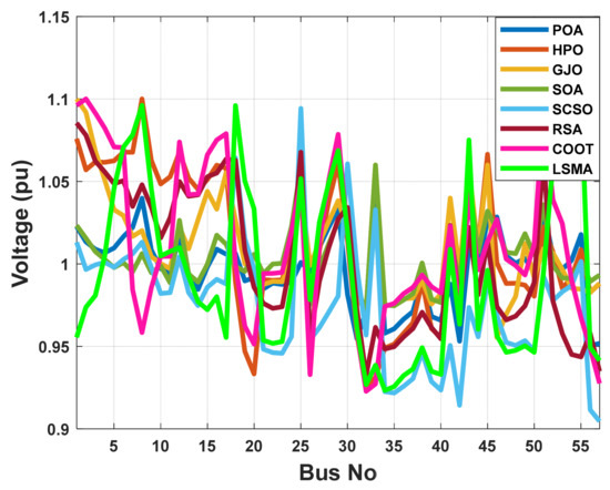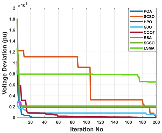 The aim function to be improved using the POA algorithm in this part is decreasing voltage deviation. The voltage profile performance can be illustrated by Figure 24. Figure 25 illustrates the pattern of decreasing system voltage divergence. Table 9 indicates that the voltage deviation index is brought down to 0.755485 pu by using the POA algorithm. The POA method significantly outperforms other population-based optimization strategies in Table 9, which compares solutions obtained using these methods.