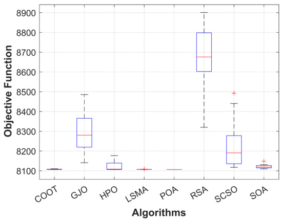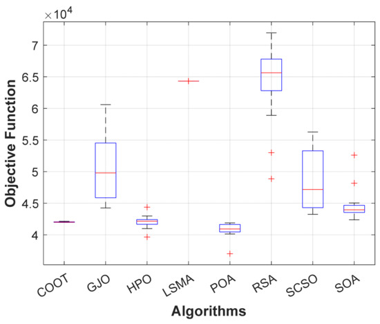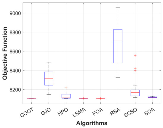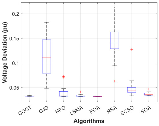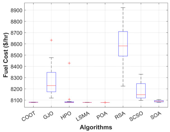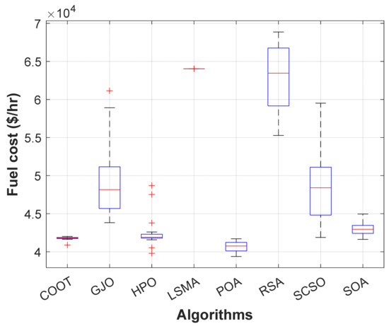 When using the POA algorithm, fuel cost reduction is a target function. Figure 19 depicts the convergence graph of fuel cost reduction using the POA algorithm. The approach needs 40 iterations to get the optimal solution, demonstrating the remarkable convergence rate of the POA algorithm. Table 7 lists the optimal cost-minimization values and the appropriate changes to the design variables. Using the POA algorithm, the findings show a significant reduction in fuel costs to 40687.44 dollars/h. Additionally, for this scenario, the average computing time for a single loop is 2.3 s. These results demonstrate how the POA algorithm performs well in terms of solution optimality and quick convergence. To further verify the effectiveness of the POA method, the fuel cost determined by different alternative heuristic optimization techniques is compared with it. Table 7 shows how superior the POA algorithm is to earlier methods. The majority of solutions found using heuristic optimization techniques are impractical, mainly due to voltage magnitude infringements at one or more system load buses, as shown in Figure 20. Figure 21 displays the boxplots for minimizing the fuel cost with the lowest values by the proposed POA algorithm.