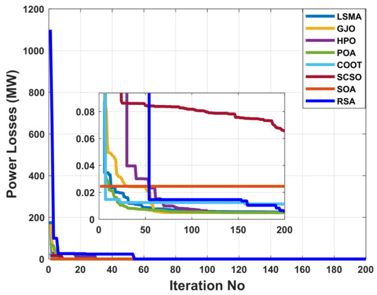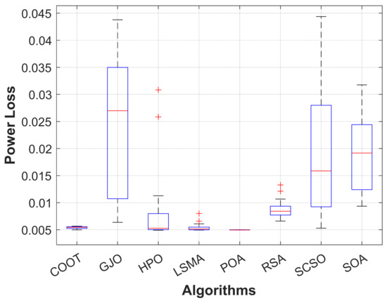 Real power loss was the desired outcome here. The POA algorithm was utilized to arrive at the most efficient solution, the results of which are given in Table 3. The POA algorithm is extremely useful for establishing the precise settings of the control variable, which diminishes system losses. As a result, when the POA algorithm is used, real power losses are reduced to 0.498 MW. In Figure 6, real power losses utilizing the POA method are steeply convergent while taking other comparative techniques into account. Within 50 iterations, the algorithm reaches the optimum solution, demonstrating how rapidly it converges. The evaluated real power loss is compared to that found before using published population-based optimization techniques in order to assess the performance of the approach. Table 3 demonstrates how the POA algorithm outperforms these prior methods. As shown in Figure 7, heuristic optimization algorithms produce feasible results. The reason for this is the magnitude of voltage accepted on all system load buses. Figure 8 shows a boxplot of results for each approach with further analysis to support the performance of the suggested technique.