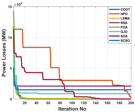 The convergence characteristics of POA and other compared algorithms for case 3 in a standard IEEE-57 bus test system.