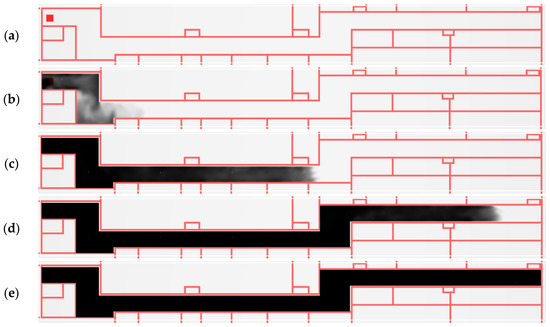 Variant A. Smoke propagation at a height of 1.8 m in subsequent time steps: (a) 0 s; (b) 60 s; (c) 120 s; (d) 180 s; (e) 240 s; Ref. (a) Red square indicates the source of the fire.