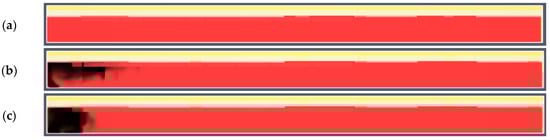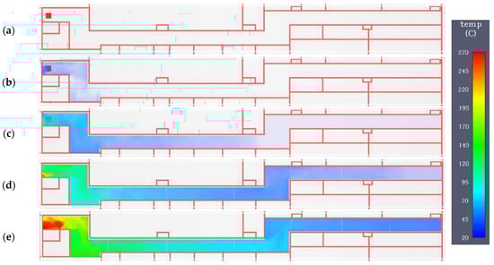In the fire area, the temperature rises much faster than in the rest of the corridor. The maximum temperature in zone IV is reached 470 s after the fire starts and is 120 °C. Zone V was partially covered with smoke, but the temperature there is relatively low, i.e., 20–40 °C (Figure 12).