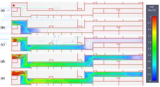 Variant A. Speed field at a height of 1.8 m in subsequent time steps: (a) 0 s; (b) 60 s; (c) 120 s; (d) 180 s; (e) 240 s.