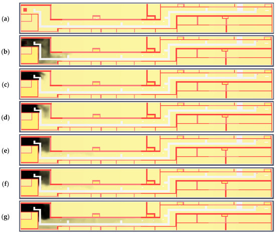 Variant C. Smoke propagation at a height of 1.8 m in subsequent time steps: (a) 0 s; (b) 60 s; (c) 120 s; (d) 180 s; (e) 240 s; (f) 300 s; (g) 470 s; Ref. (a) Red square indicates the source of the fire.