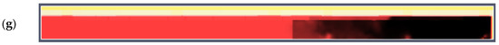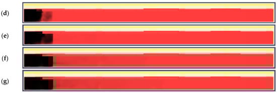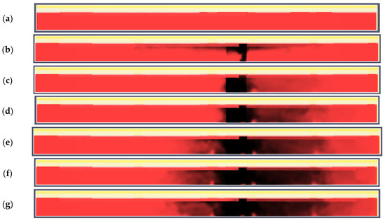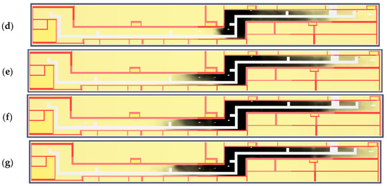 Variant B. Smoke propagation in the vertical cross-section of the technological corridor showing in subsequent time steps: (a) 0 s; (b) 60 s; (c) 120 s; (d) 180 s; (e) 240 s; (f) 300 s; (g) 360 s.