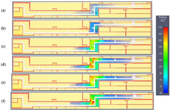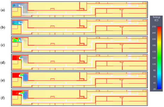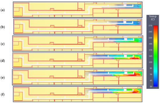 Variant C. Temperature field at a height of 1.8 m in subsequent time steps: (a) 60 s; (b) 120 s; (c) 180 s; (d) 300 s; (e) 400; (f) 470 s.