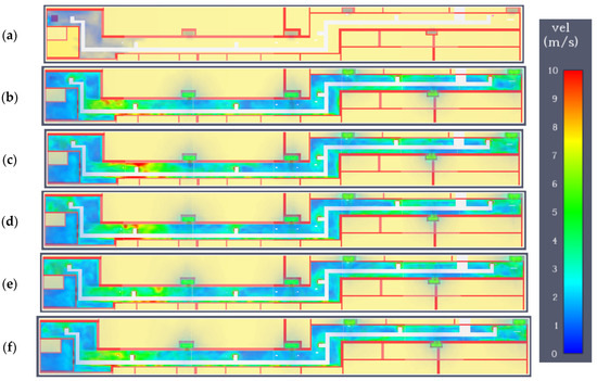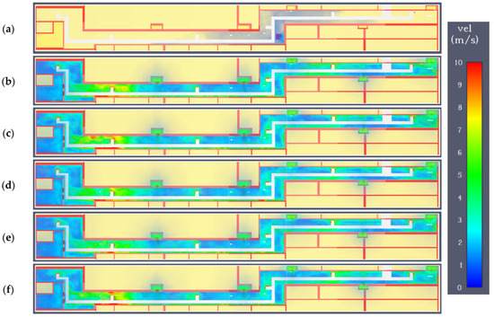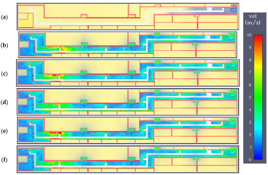 Variant C. Speed field at a height of 1.8 m in subsequent time steps: (a) 60 s; (b) 120 s; (c) 180 s; (d) 300 s; (e) 400; (f) 470 s.